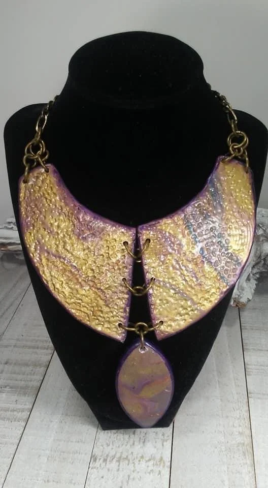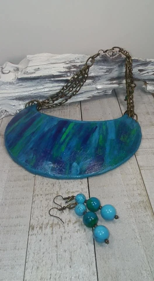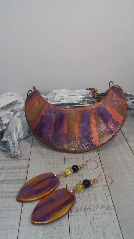 Clay jewelry is unique and individual. No matter how many times you make a piece of clay jewelry, it will always be unique. It is cut, molded, baked, sanded, decorated by paint, mica powder, beads, and other techniques too numerous to name, and glazed to seal and protect it's beauty.